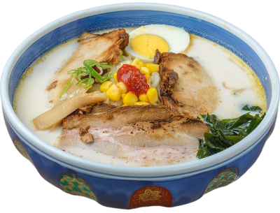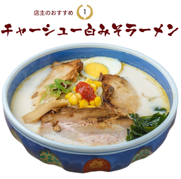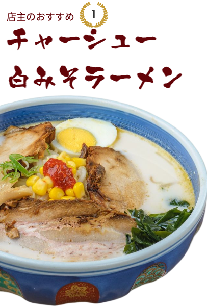 揉んで縮れを出した麺に、白みそのスープがからみ、美味しさを引き立ちます。秘伝のスープは、ピーナツ油でコクを出し、すりごまで香り高く。口の中でじゅわっと肉のうまみが広がる自家製チャーシューは、スープの中でことことと3時間煮込んで柔らかくします。麺が隠れるほどに大きな切り身をのせますので、どうぞ心ゆくまでお楽しみ下さい。